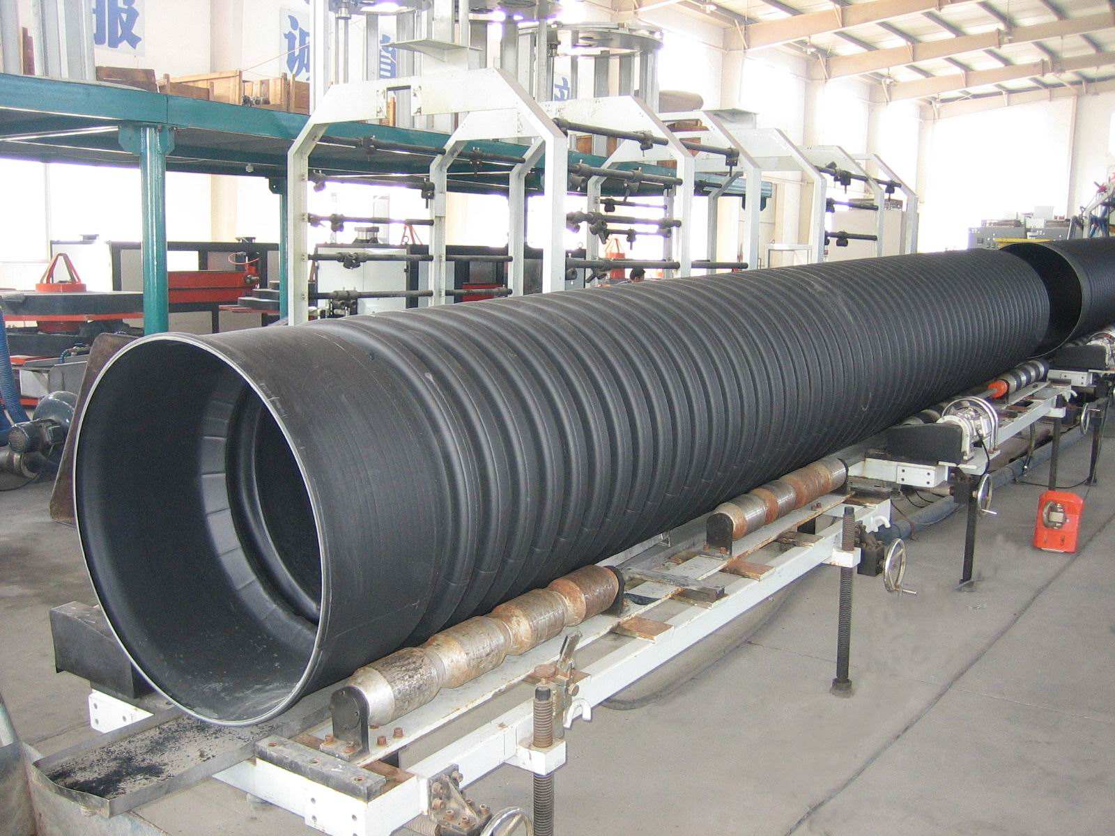 HDPE双壁波纹管是以高密度聚乙烯为原材料,经挤出和特殊的成型工艺加工而成。产品内壁光滑,外壁为封闭波纹的特殊管道。在加工过程中,材料通过高温挤出,在专用的成型机头和成型磨具内,将内外层材料在波峰分开,并在波谷内熔合为以整体,在磨具内通过真空方式成型并冷却。